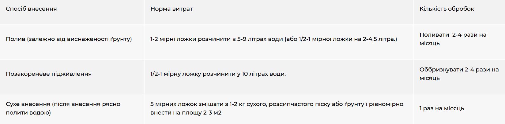 - Простота застосування: Добриво легко використовувати, завдяки мірній ложечці можна правильно розрахувати потрібну кількість для поливу або сухого внесення.