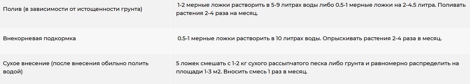 Состав: азот (N) – 16.7%; фосфор (P2О5) – 12%, калий (K2О) – 15%; мезоэлементы: сера (S) – 49 г/кг, магний (MgO) – 3.2 г/кг; микроэлементы: бор (В) – 0.31 г/кг, железо (Fe) – 1.6 г/кг, марганец (Мn) – 0.34 г/кг, цинк (Zn) – 0.32 г/кг, медь (Cu) – 0.23 г/кг, молибден (Мо)